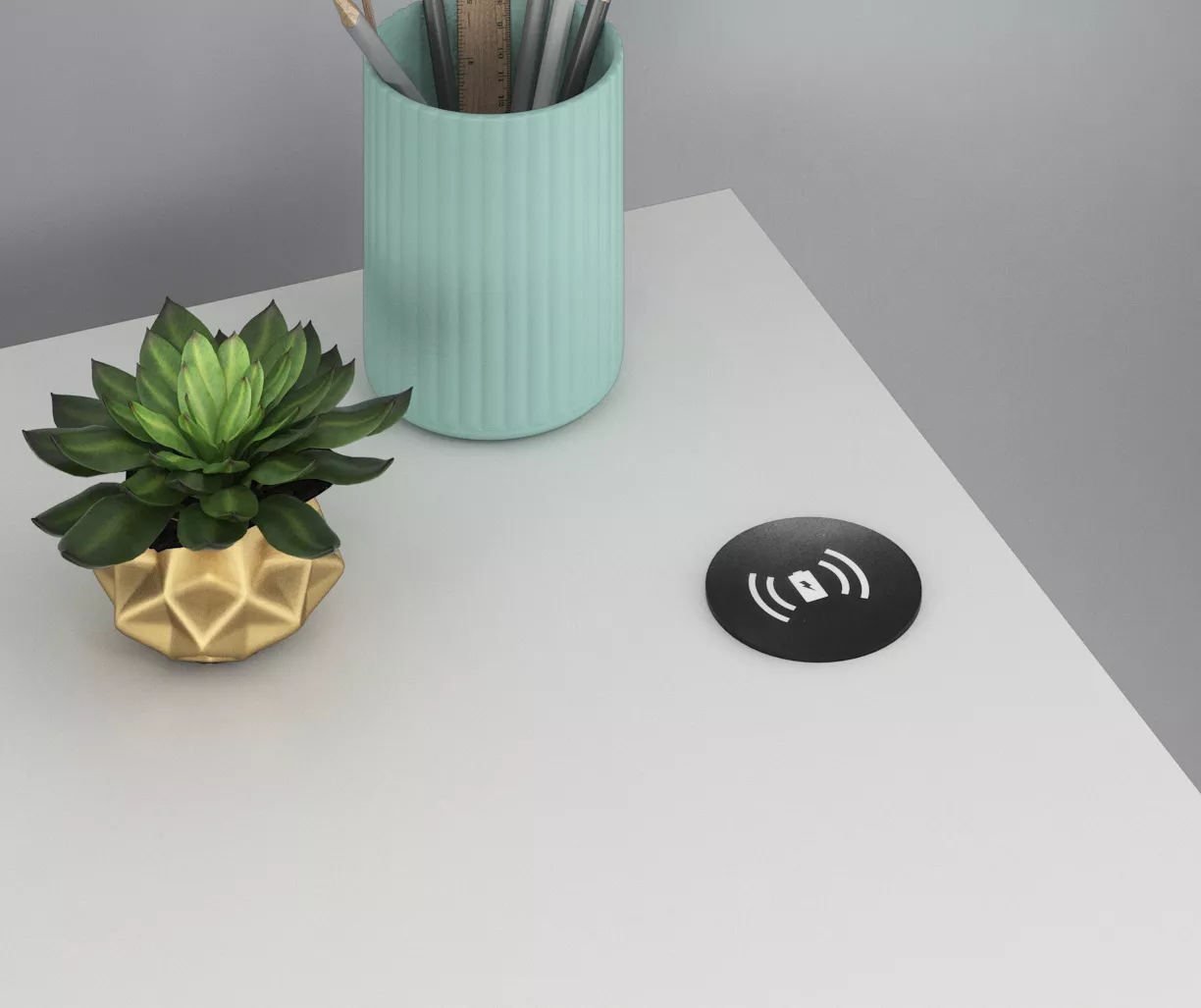 - Wireless charging spot on the desktop is compatible with all Qi-enabled devices and allows you to charge without the hassle of cords