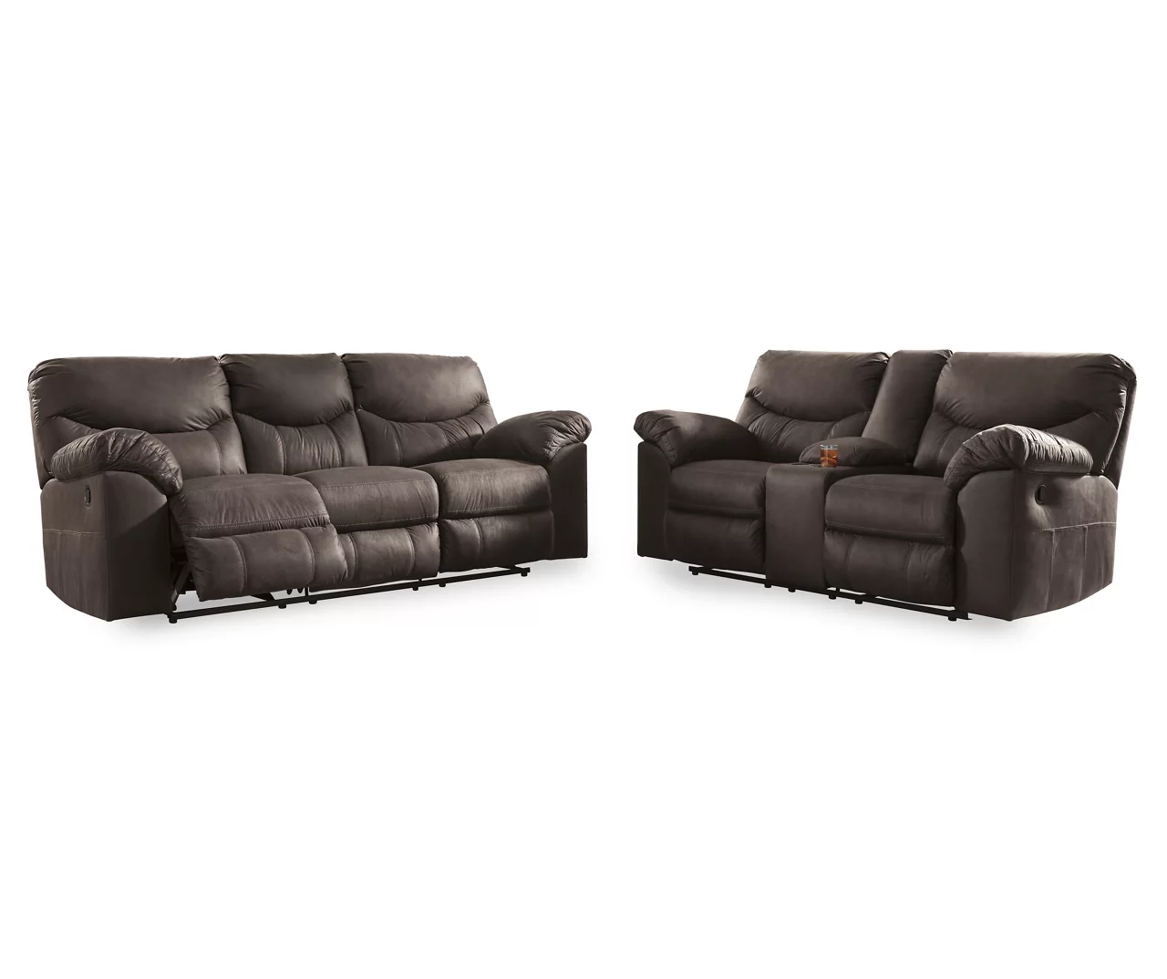 Rock the cool look of leather minus the hefty price tag with this reclining sofa from Ashley. Rich with tonal variation, the indulgently soft upholstery sure looks like the real thing. And talk about indulgent comfort! Double stuffed armrests and sumptuous cushions cradle and support in all the right places. Distinctive scooped stitching enhances this reclining sofa’s contemporary flair and make it a great addition to a living or family room.