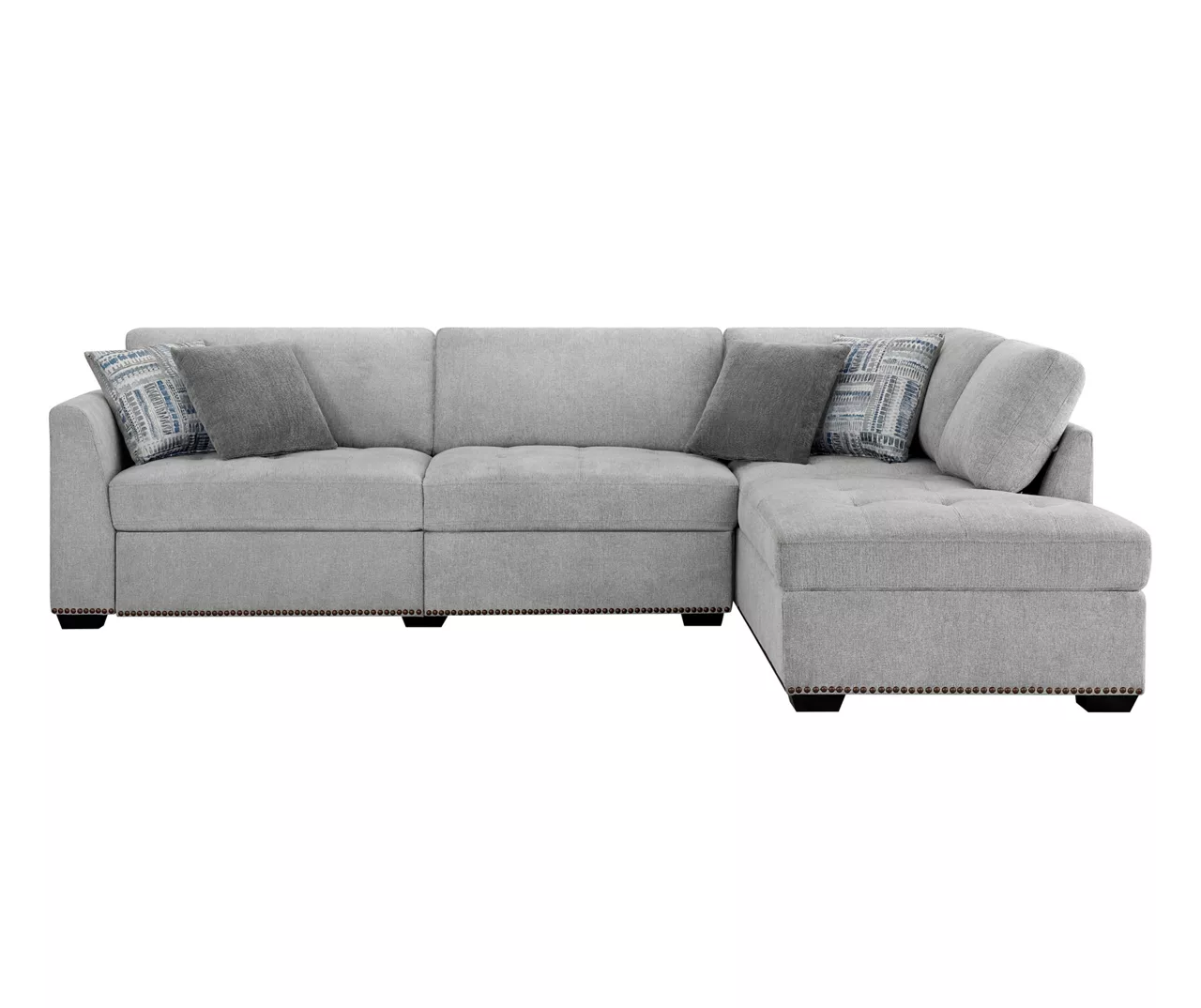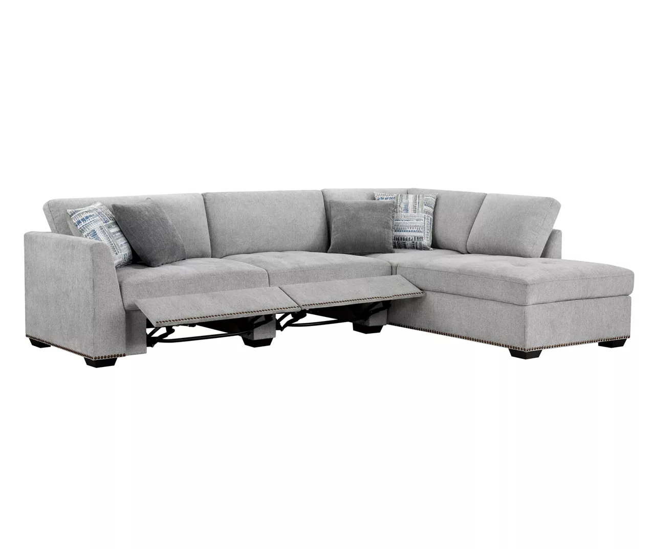 Whether enjoying movie nights with the family or watching the big game with friends, the Broyhill Anaheim sectional provides kickback comfort you will surely enjoy. With two built-in power reclining footrests and a lounging chaise, this sectional offers plenty of space for you and your loved ones to stretch out and relax. Plus, the angled arm design, tufted seat cushions and nail trim accents add a touch of sophistication that complements almost all home décor.