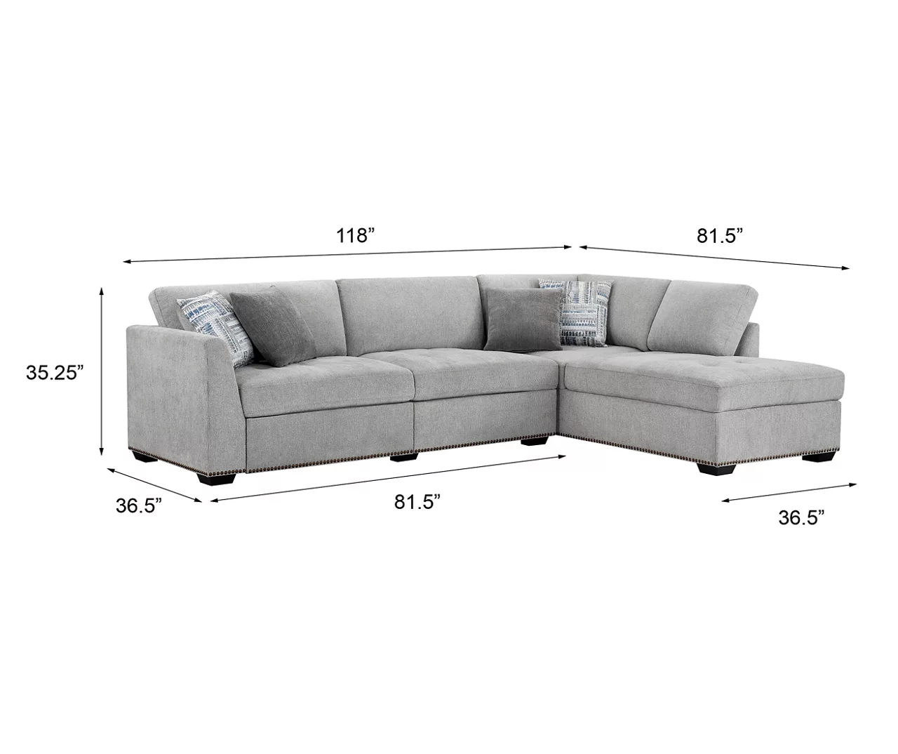 - Right-arm-facing chaise product dimensions: 36.5″L x 81.5″W x 35.25″H