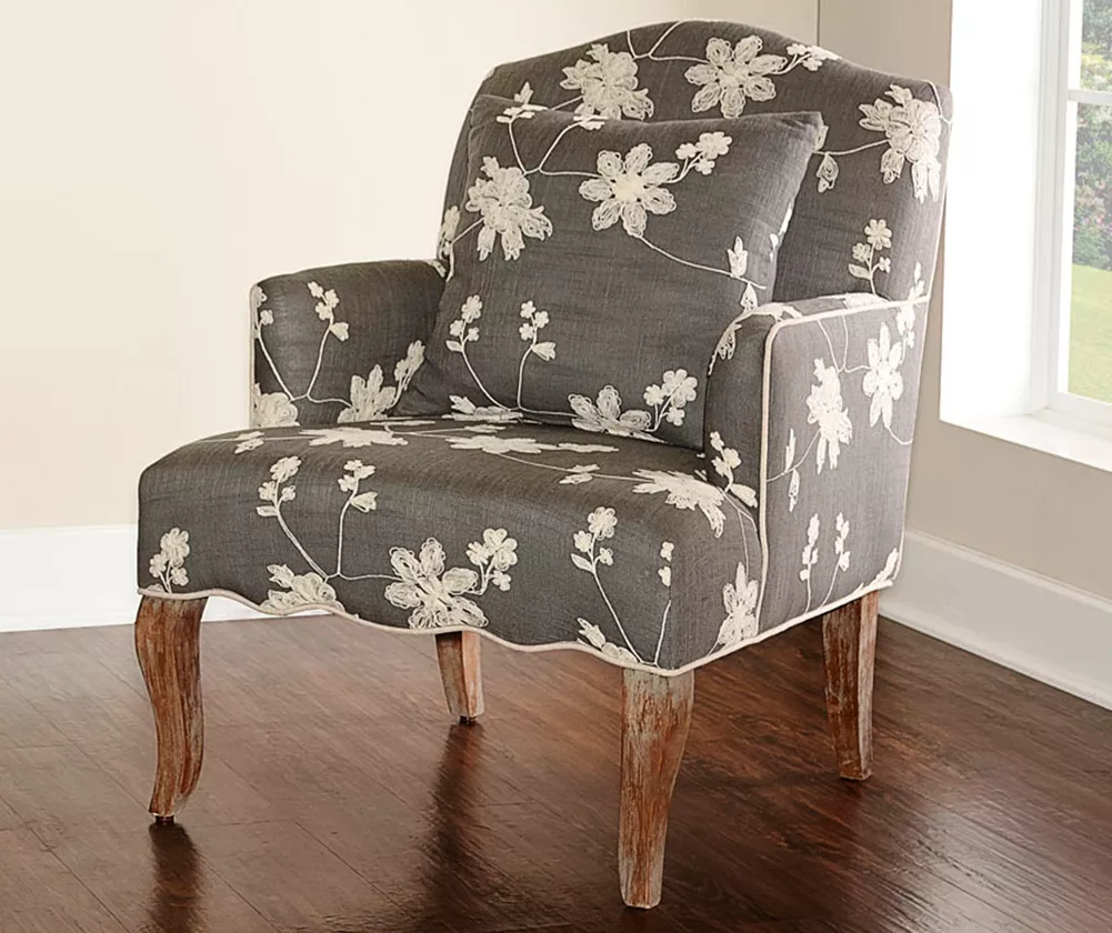 - Gray fabric is accented with cream embroidered floral design