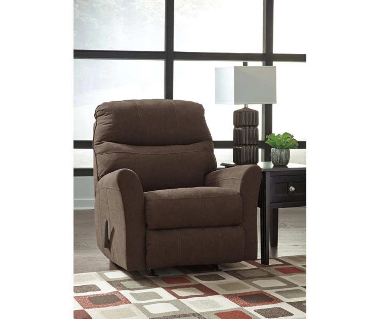 Destination: relaxation oasis. Elevate your design aesthetic with this rocker recliner. Plush yet structured cushioning packed with metro modern flair, this recliner is where sophisticated style meets everyday comfort. Recline in infinite positions of soft comfort with one pull.